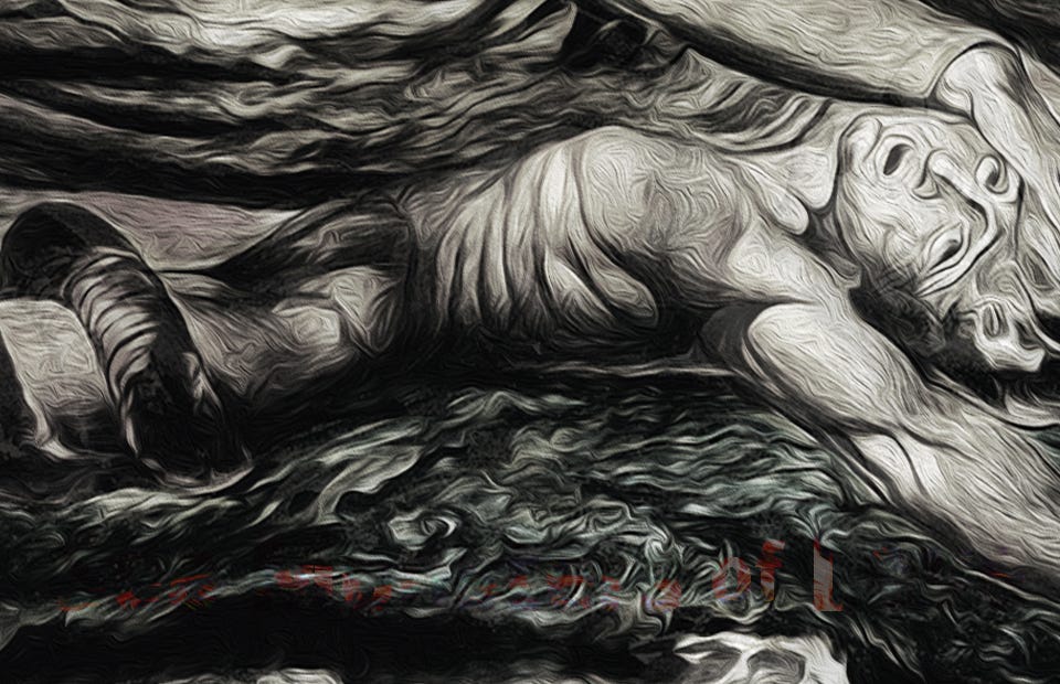 Thus, Hoare opens proceedings with Blake’s 1795 briny-enough image, Elohim Creating Adam.3 The rising sun behind perhaps stands in for the Morning Stars that sang together at the moment of the Elohim / Jahweh’s triumph over chaos, or perhaps it simply mirrors the divinity. Adam’s leg and groin are coiled about provocatively by the Serpent. Adam himself lies on the rocky shore, racked by his own birth pangs, stupefied by the agony of his own emergence.